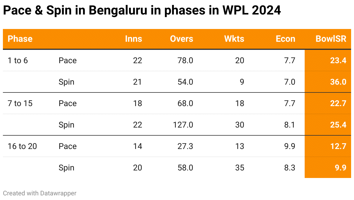 Pacers have done well during powerplay and middle overs having better bowling strike rate compared to spinners.