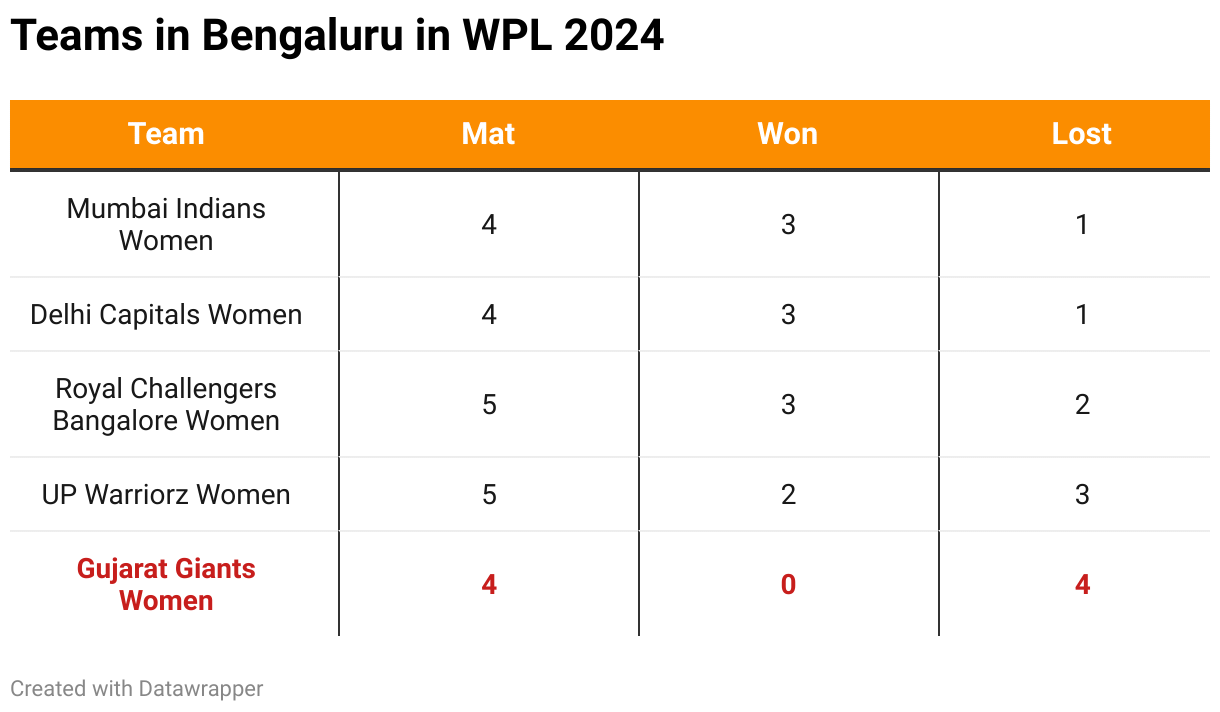 All five teams played a minimum of four games in Bengaluru in WPL 2024 with RCB and UPW playing five games each. Gujarat Giants had a terrible time in Bengaluru last year losing all their four games. MI and DC won three of the four games. Whereas, home team RCB won three of five and UP Warriorz lost three out of five games.