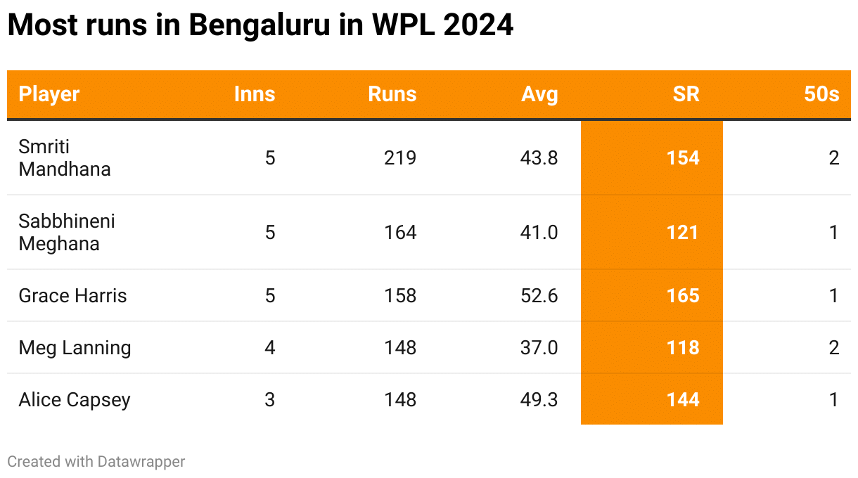 Smriti Mandhana has always performed in Bengaluru irrespective of representing RCB or team India. During WPL 2024, she was the highest run scorer in the Bengaluru leg scoring 219 runs at a terrific Strike rate of 154 with two fifties. Meg Lanning too smashed two fifties in four games at this venue last year.