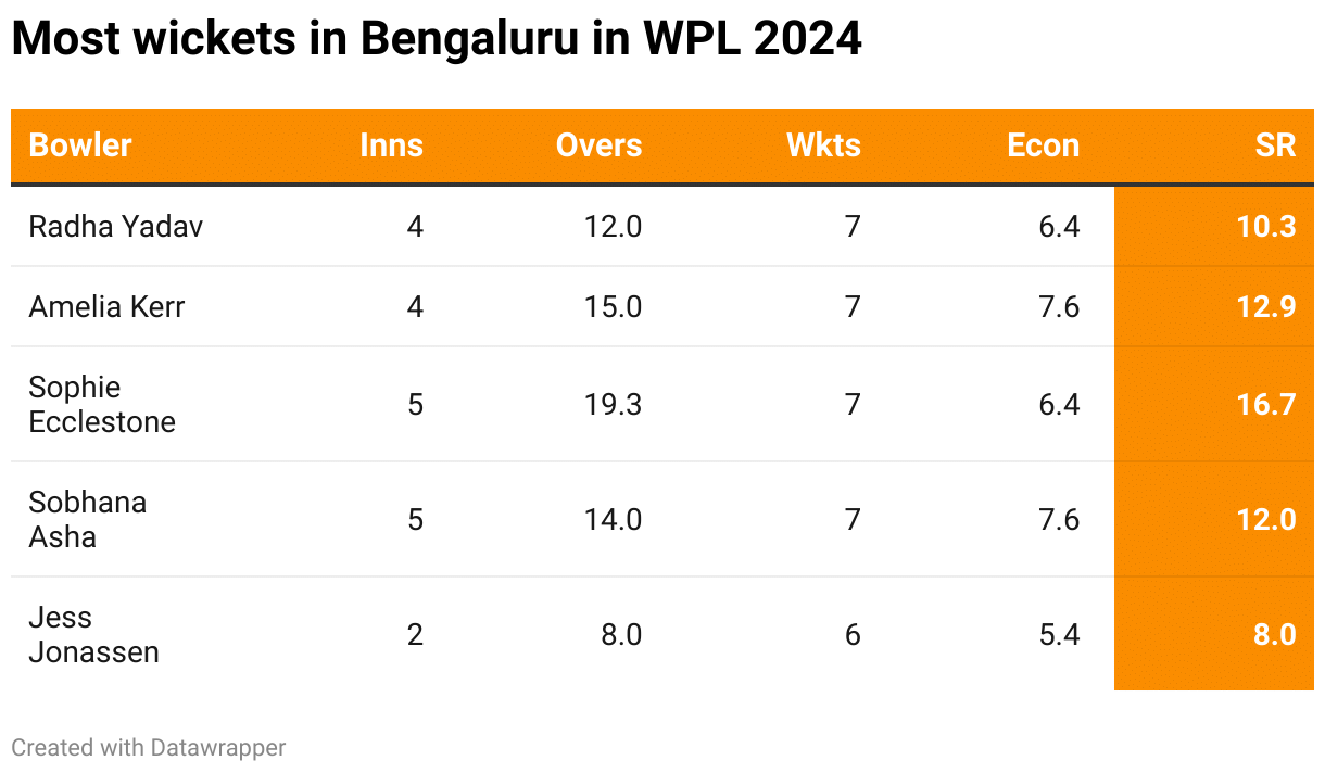 Spinners dominated in Bengaluru last year with top five wicket takers being spinners. Leg spinners in Amelia Kerr, Asha Sobhana and left arm spinners in Radha Yadav, Sophie Ecclestone and Jess Jonassen were amongst wickets with a good bowling SR.