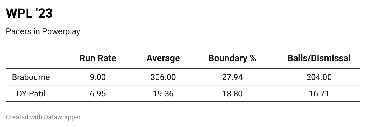 Pacers, in particular, have had absolutely nothing to work with at Brabourne. Megan Schutt, during a mid-game interview, mentioned that it seemed like they’ve just asphalted the center & called it a pitch. Couldn’t have explained it better, even if we tried.