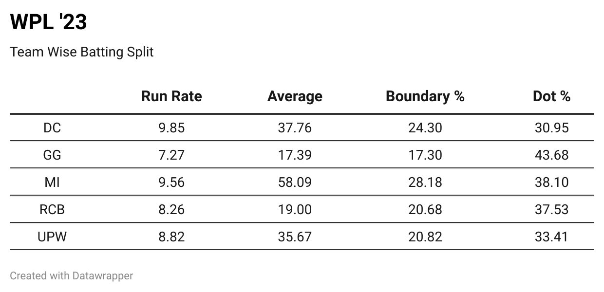 DC and MI have been leading on the batting front. In MI’s case, their excellent bowling performances have meant that they’ve only been chasing under par totals. Such has been their top order’s domination that MI batters outside the top six have faced only one delivery, so far. DC’s openers have carried their batting till now, with Meg Lanning & Shafali Verma being amongst the top three run scorers. What’s also helped is that their middle-order have come up with crucial contributions to ensure that no momentum is lost. They rank second in boundary % and have the lowest dot % as well.