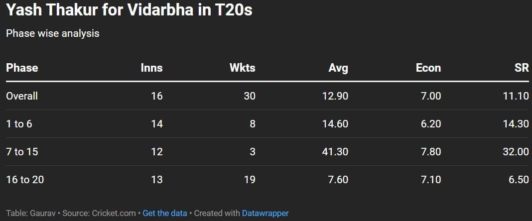 So far in his IPL career, he has bowled only seven overs in the powerplay out of the 42.4 he has bowled so far. But for his state side, Vidarbha, he began as a new ball bowler when he first arrived. Later on, he moulded himself into a death ball bowler because that’s what Vidarbha needed him to do.