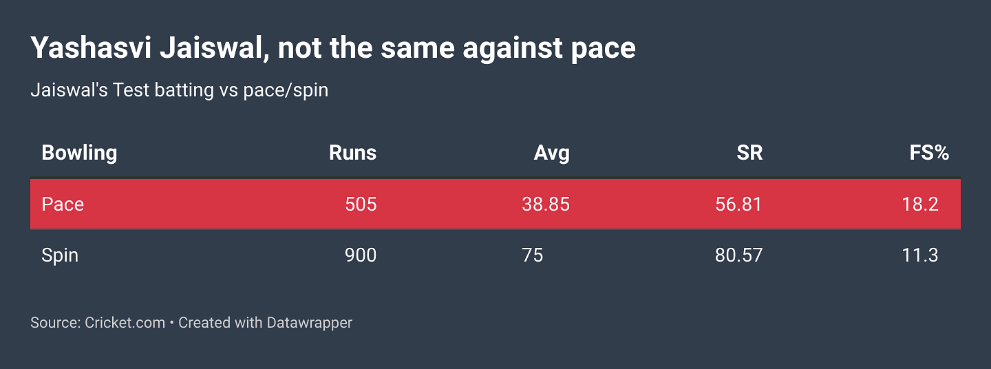 In his illustrious career thus far, it has been quite clear how Jaiswal hasn’t been as prolific against pacers as he has been against the spinners. Purely from a numbers perspective, he averages almost twice against spinners, strikes at almost 43% quicker and has scored almost twice the runs.