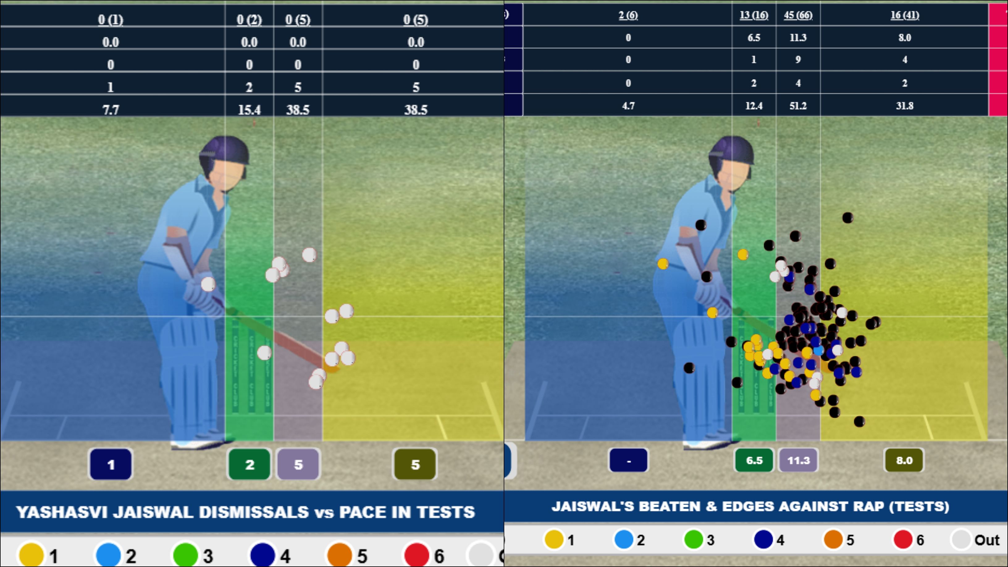 Image from L-R: Jaiswal's dismissals vs pace in Tests and Jaiswal's beaten & edges against RAP in Tests