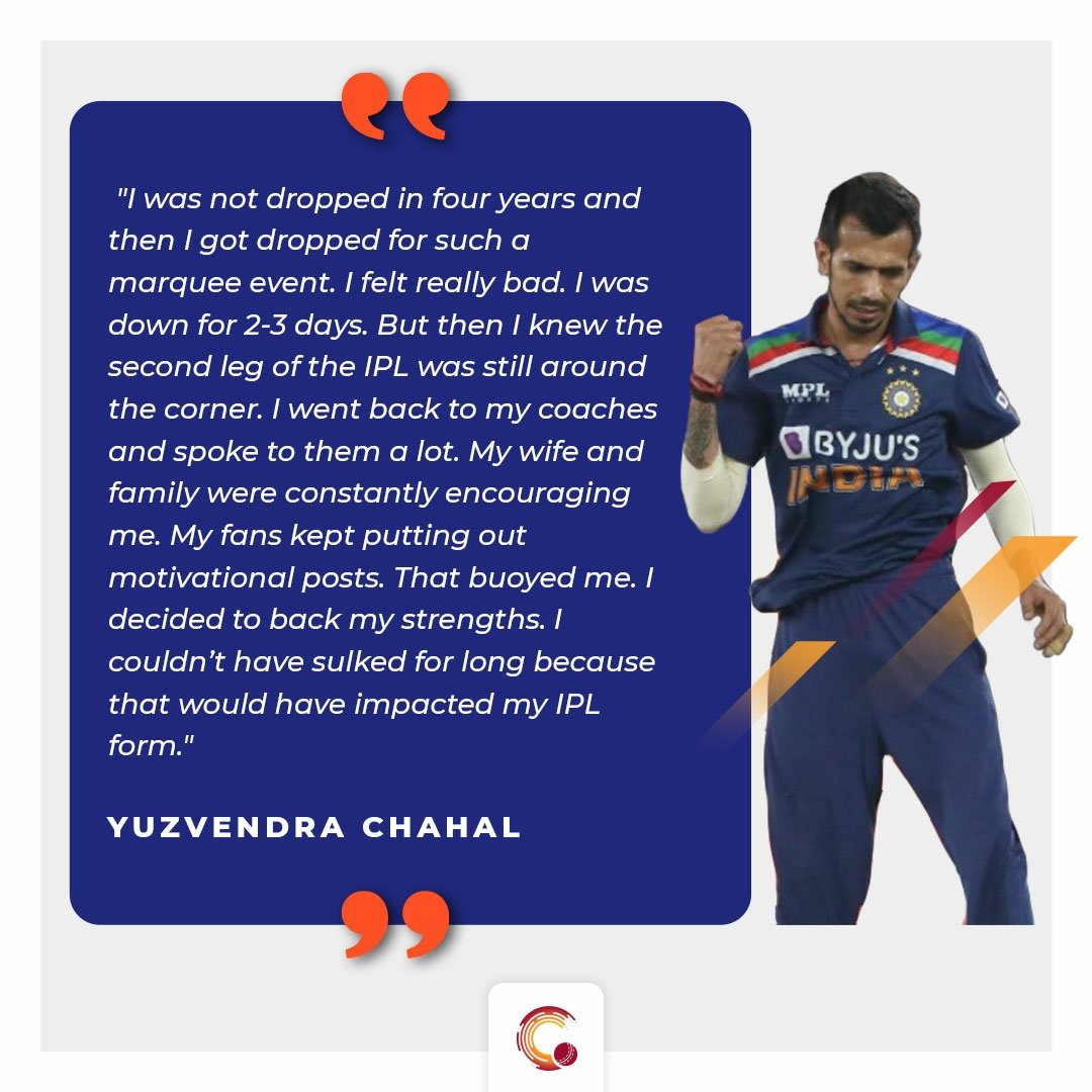 “I was not dropped in four years and then I got dropped for such a marquee event. I felt really bad. I was down for two-three days. But then I knew the second leg of the IPL was still around the corner. I went back to my coaches and spoke to them a lot,” Chahal told the Times of India.
