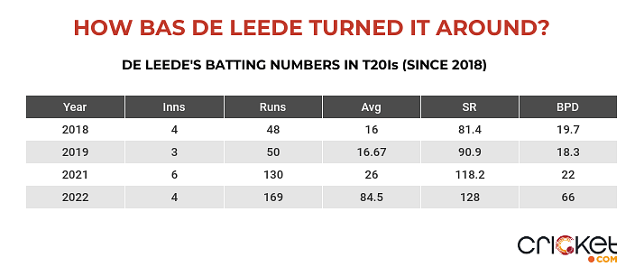 In years preceding the qualifiers, Leede only struck at a strike-rate of 81.4, 90.9 and 118.2 with the bat, whilst averaging 16, 16.7 and 26. But the trust that was instilled in the all-rounder ultimately landed Netherlands the gold, with the all-rounder scoring 169 runs in the Qualifiers, averaging 84.5 and striking at 128.